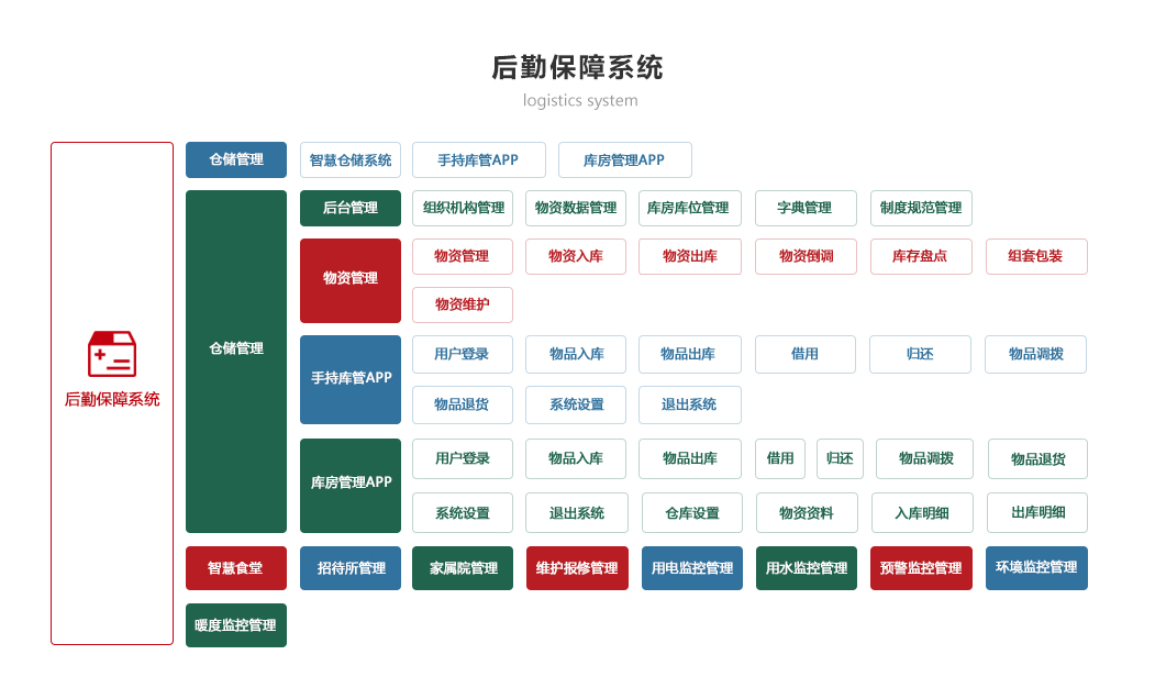 綜合保障系統(tǒng)依托物聯(lián)網(wǎng)、RFID識別和傳感技術(shù),著眼作戰(zhàn)精準(zhǔn)保障、戰(zhàn)備常態(tài)保障和官兵生活保障,對戰(zhàn)備物資、裝備器材、營房物資和被裝物資等的全生命周期的電子化管理,對官兵的健康實時監(jiān)護(hù)。包含財務(wù)管理、軍需油運、武器裝備、衛(wèi)勤管理、營房管理模塊。確保部隊出動,車輛給養(yǎng)油料跟得上,裝備維護(hù)情況實時掌握,營房管理工作平時與戰(zhàn)備同步推進(jìn)。